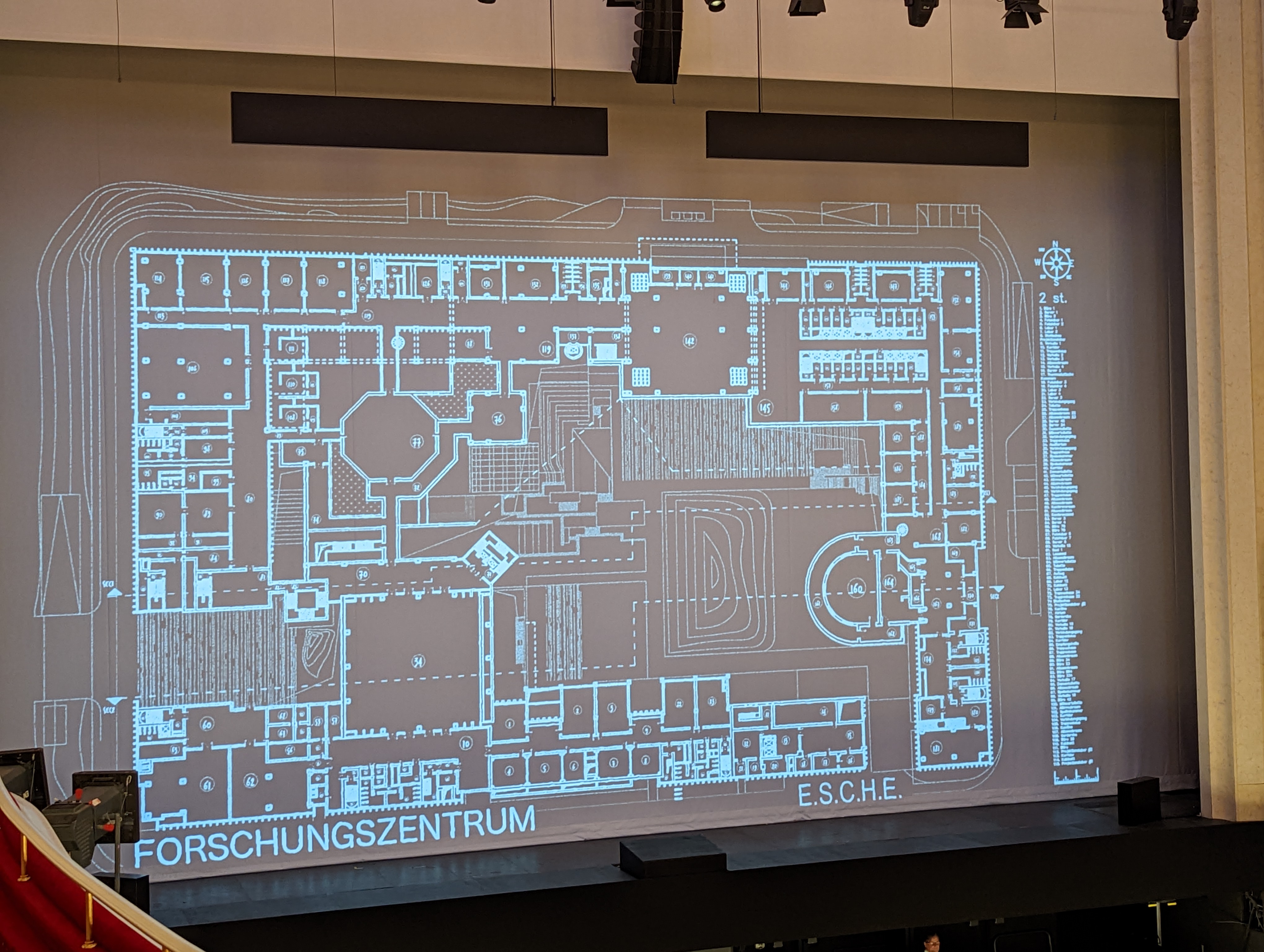 In der „Götterdämmerung“ schließlich – sicher der schlüssigste Teil dieser Tetralogie und auch musikalisch unter Guggeis ein Höhepunkt, zumal die quirlig-silbrige Rheinfahrt oder die dumpfen Schläge bei Siegfrieds Tod – gibt es Aspekte, die tiefer loten. Etwas modisch aufgesetzt vielleicht die blau-gelbe Einkleidung Siegfrieds zur Rheinfahrt. Aber dann doch der Schluss, wenn Brünnhilde (grandios Anja Kampe mit strahlenden Höhen und auch dezentem piano) alle, insbesondere die ahnungslose Gutrune (klangschön Mandy Fredrich), aus dem Raum verweist und zunächst nur der gebückt am Stock tapsend-weißhaarige Wanderer bleibt. Bis sie auch ihn des Raumes verweist. Dass sie sich samt Miniatur-Grane auf Siegfried legt, etwas befremdlich. Dann fährt der Sterberaum zur Seite wie in einen Verbrennungsofen und auf der dunklen leeren Bühne kommt die gealterte Brünnhilde angeschlurft mit Reisetasche, der arbeitslosen Erda begegnend. Dazu der Text auf der Rückwand, dass sie nie mehr Walhall sondern nur noch Wunschheim aufsuchen will. Und dann fährt nochmal der Decker mit dem Grundriss des angeblichen Forschungszentrums E.S.C.H.E herab und die Pixelchen lösen sich auf ins Nichts.